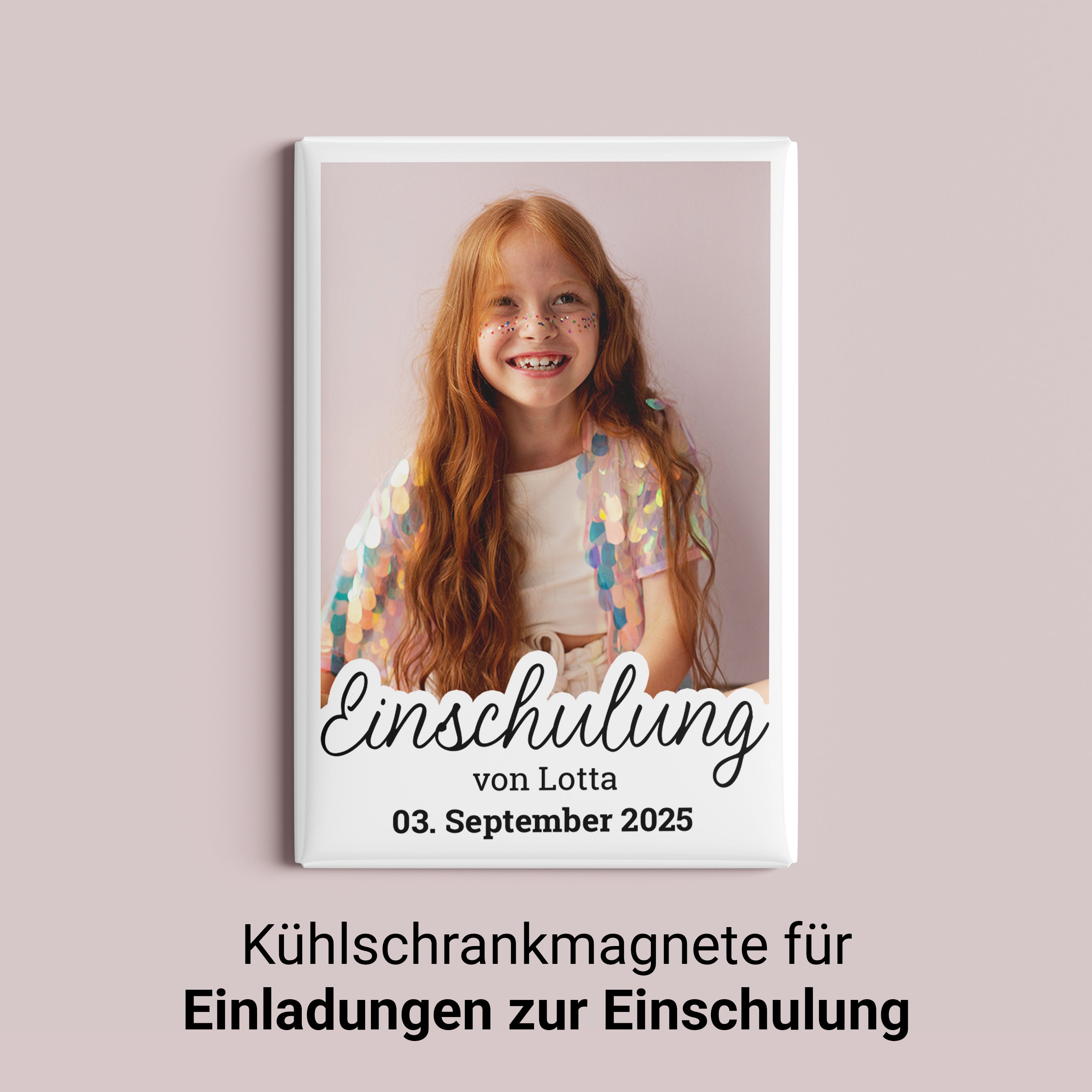 Dieser individuelle Fotomagnet ist ideal für die Einladungen zur Einschulung geeignet: Die Gäste können ihn am Kühlschrank anbringen und er erinnert jeden Tag daran, dass der große Tag näher rückt - die Vorfreude steigt!