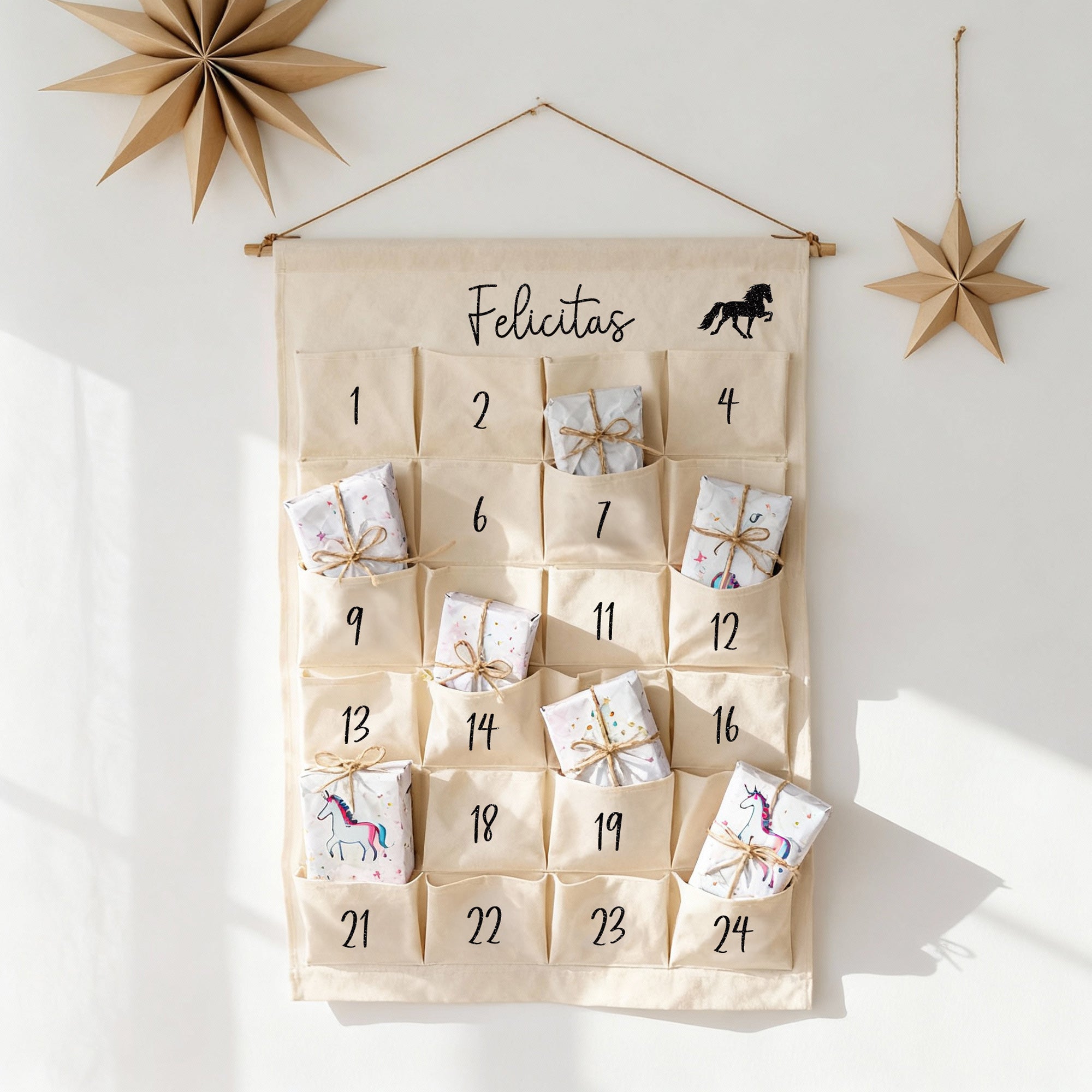 Personalisierter Adventskalender aus Stoff mit 24 Taschen & Name zum selbst befüllen | Design: Islandpferd | Tölter, Isländer