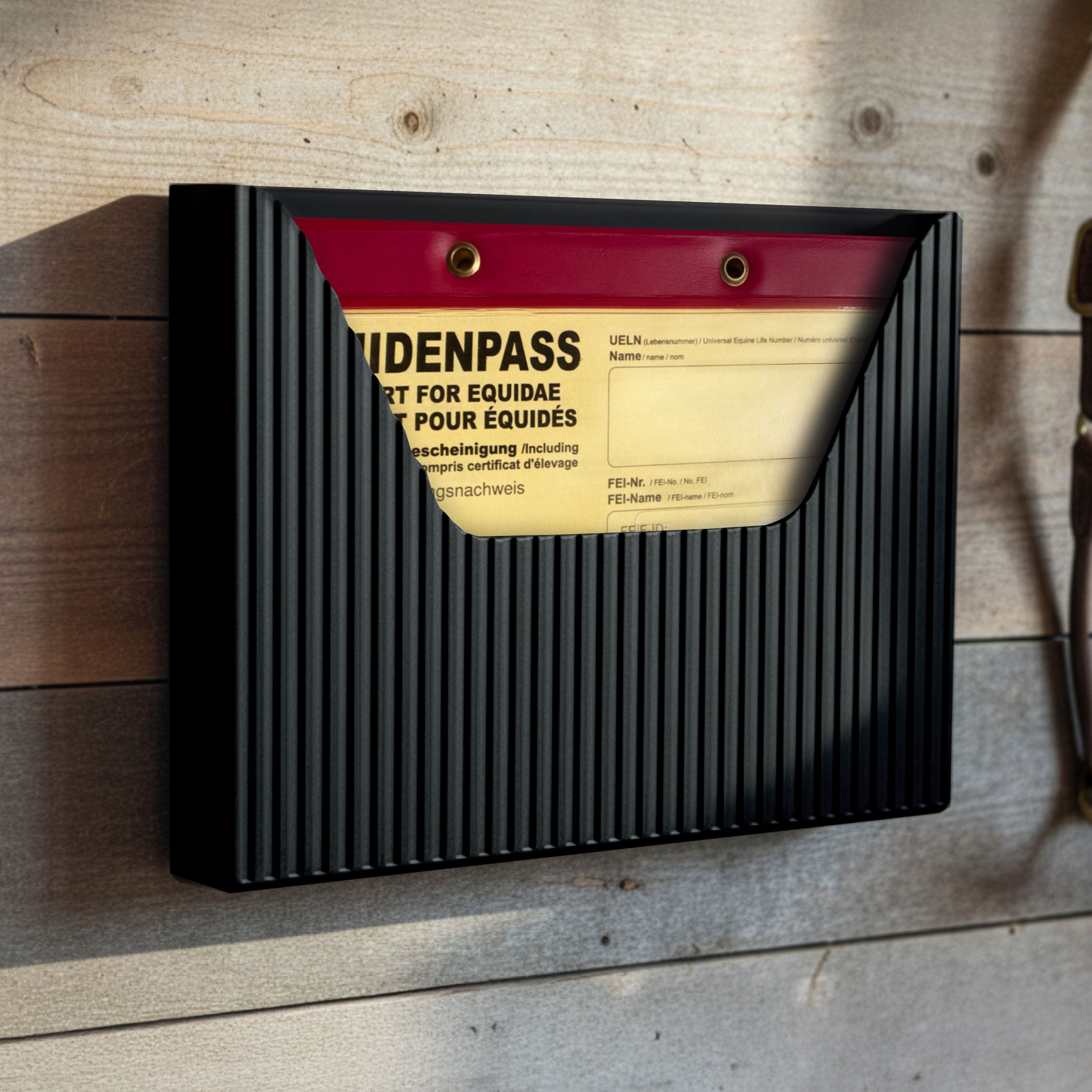 Kein Suchen mehr, kein Verlegen – der Equidenpass hat endlich seinen festen Platz. Ob dauerhaft montiert oder flexibel magnetisch angebracht: Diese Aufbewahrungslösung sorgt für Struktur und Ordnung im Stallalltag.
