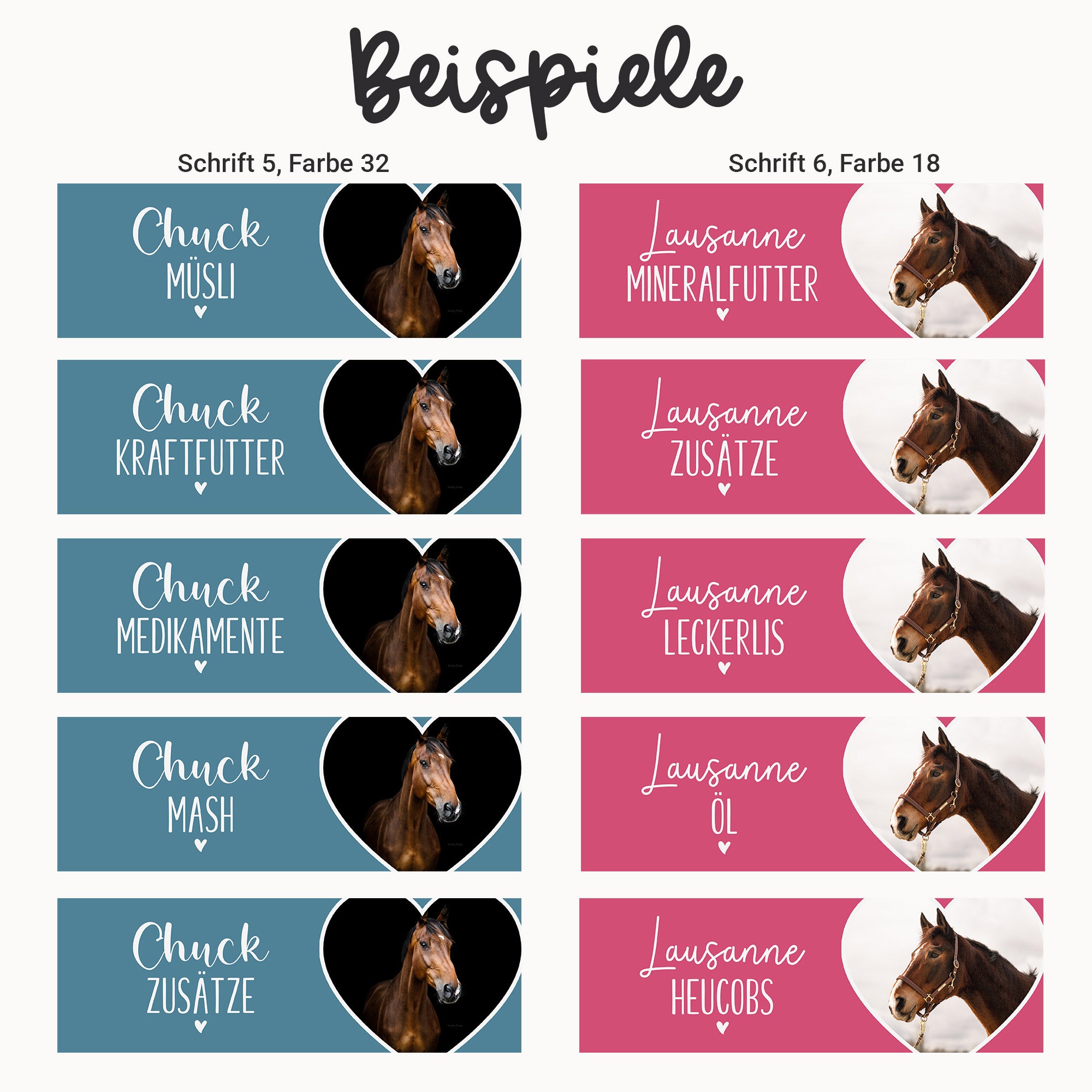 Die Bestellung ist ganz leicht: Du kannst hier auf der Seite neben dem Namen des Pferdes auch deine Wunschtexte für die Aufkleber angeben (z.B. "Müsli", "Mash", "Kraftfutter" etc.). Außerdem kannst du deine Wunschfarbe für den Hintergrund angeben.