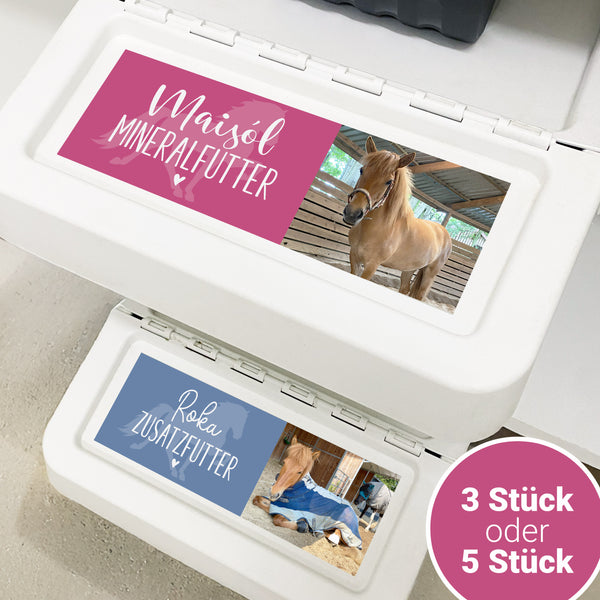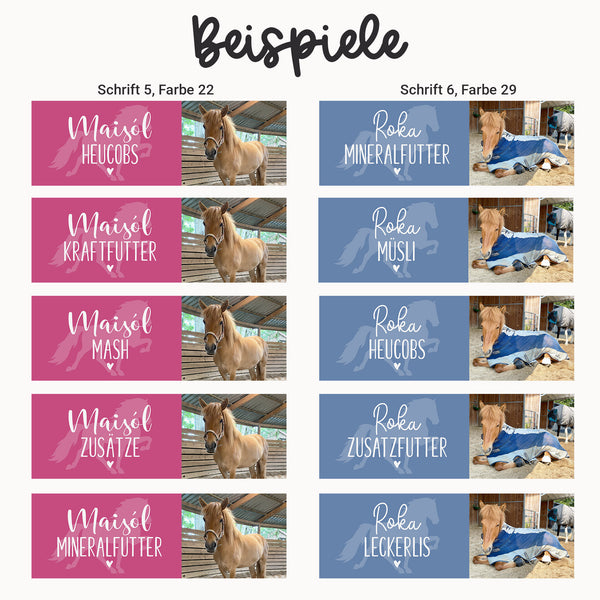 Die Bestellung ist ganz leicht: Du kannst hier auf der Seite neben dem Namen des Pferdes auch deine Wunschtexte für die Aufkleber angeben (z.B. "Müsli", "Mash", "Kraftfutter" etc.). Außerdem kannst du deine Wunschfarbe für den Hintergrund angeben.
