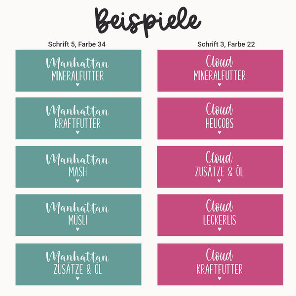 Die Bestellung ist ganz leicht: Du kannst hier auf der Seite neben dem Namen des Pferdes auch deine Wunschtexte für die Aufkleber angeben (z.B. "Müsli", "Mash", "Kraftfutter" etc.). Außerdem kannst du deine Wunschfarbe für den Hintergrund angeben.