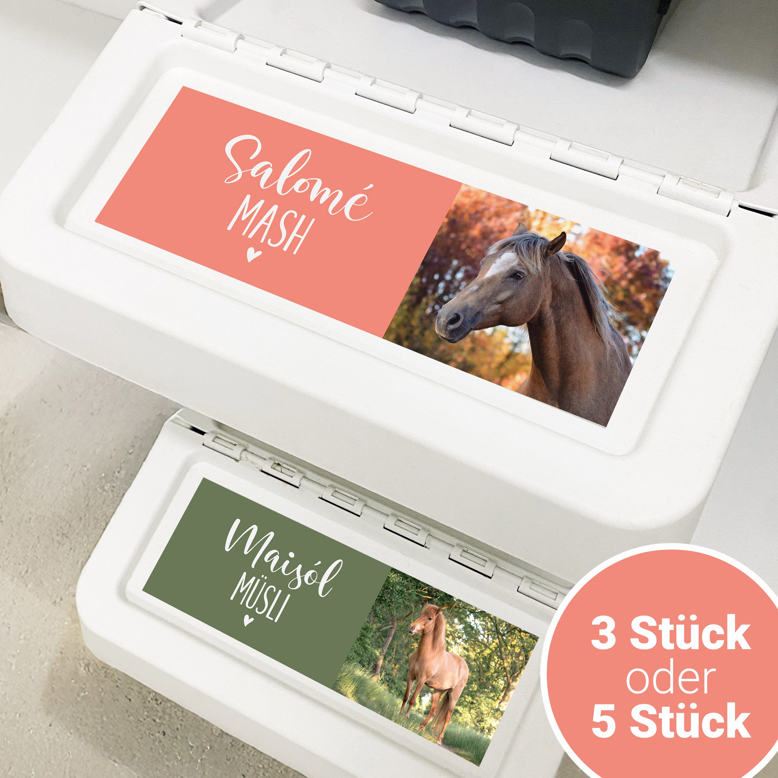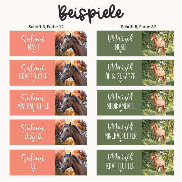 Die Bestellung ist ganz leicht: Du kannst hier auf der Seite neben dem Namen des Pferdes auch deine Wunschtexte für die Aufkleber angeben (z.B. "Müsli", "Mash", "Kraftfutter" etc.). Außerdem kannst du deine Wunschfarbe für den Hintergrund angeben.