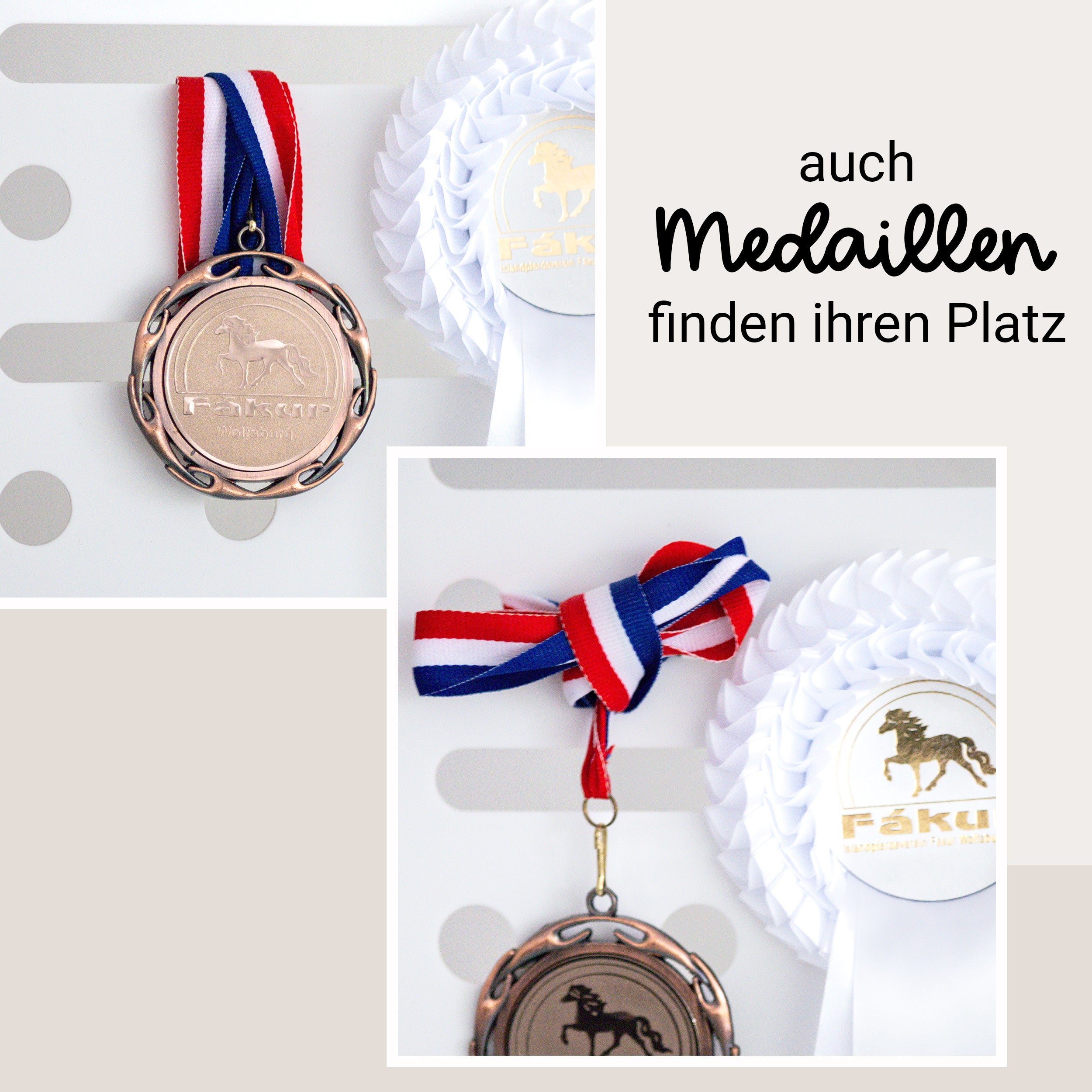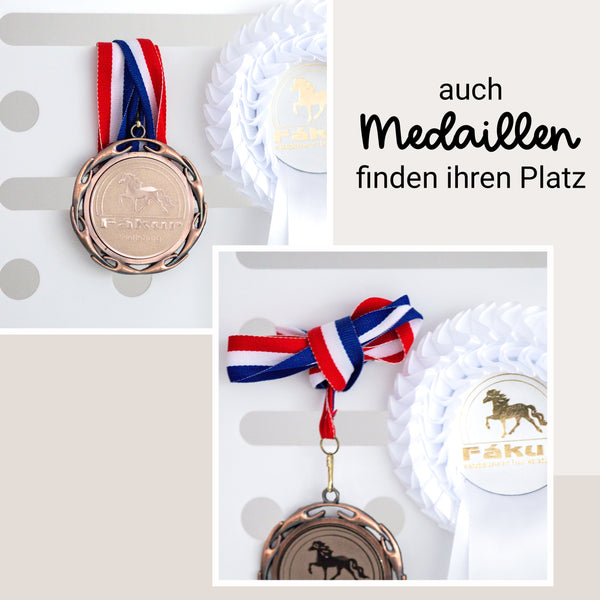 - Platz für Medaillen: Neben den Schleifen können auch Medaillen unkompliziert befestigt werden
